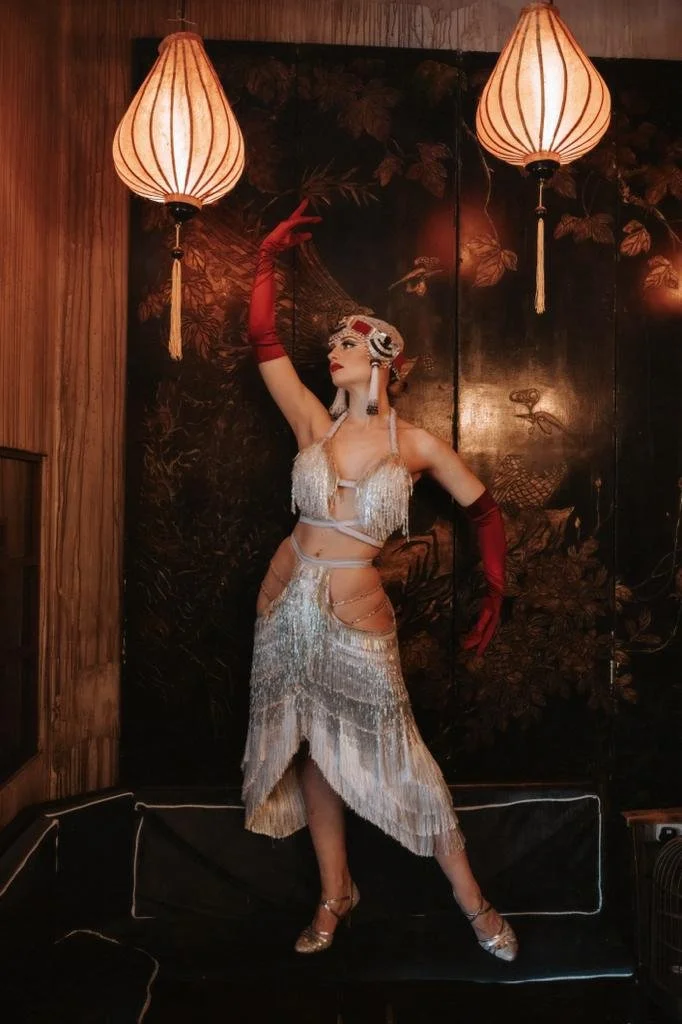 The result of a multi-year collaboration, Didi and I dreamed up this Art Deco fantasy for her performance career. We started with images of Erte and the Ziegfield Follies to create the baseline visual references. Then we dove into extravagant materials to bring this fabric to life